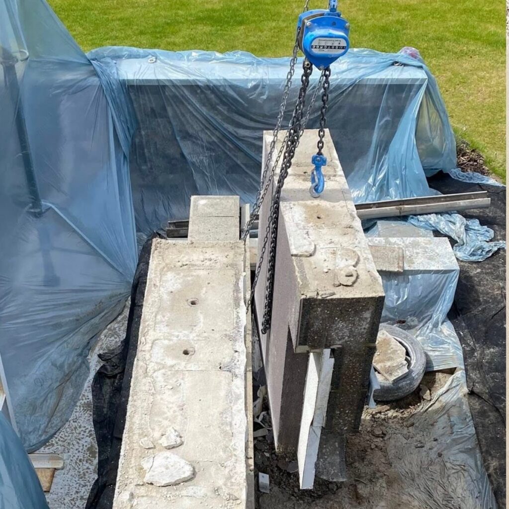 Pécs családi ház szélfogó támfal rezgés mentes bontása szabadon álló mobil darupályával